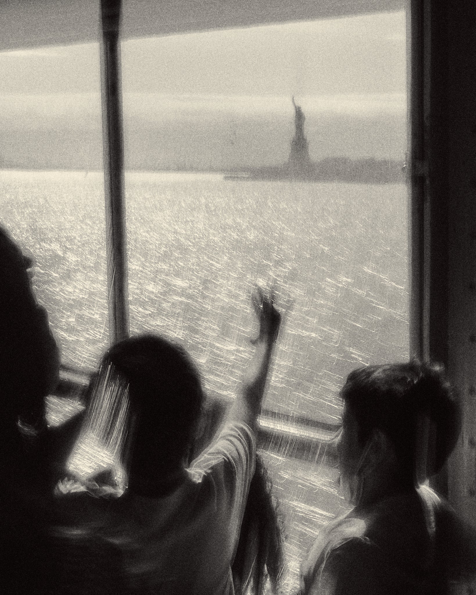 A fleeting moment captured on the Staten Island Ferry: a child, small and luminous, reaches toward the Statue of Liberty as if bridging the impossible distance between imagination and reality. The rippling water, the motion of the ferry, and the monumental figure in the background all dissolve into abstraction, leaving only the ineffable quality of wonder. It’s a vision that feels like a childhood dream - one of limitless possibility, quiet awe, and the instinctive yearning to touch something larger than oneself.