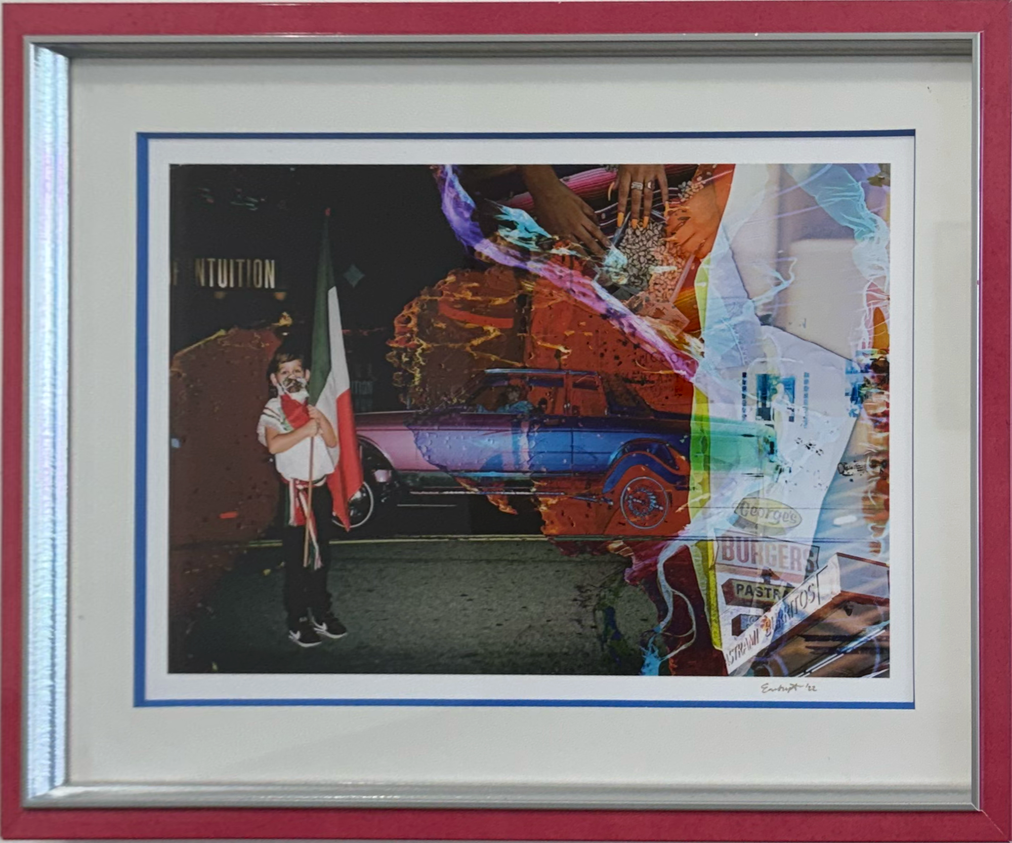 Created from a 35mm film collage, La Chicanita is a celebration of my roots as an Angeleno. The image of a young girl holding a Mexican flag in front of a woman driving a pink lowrider is a symbol of generational strength and cultural pride. Lowriders have always been a sign of success in our community, and this piece highlights the resilience and capability of the women who are at the heart of it all.