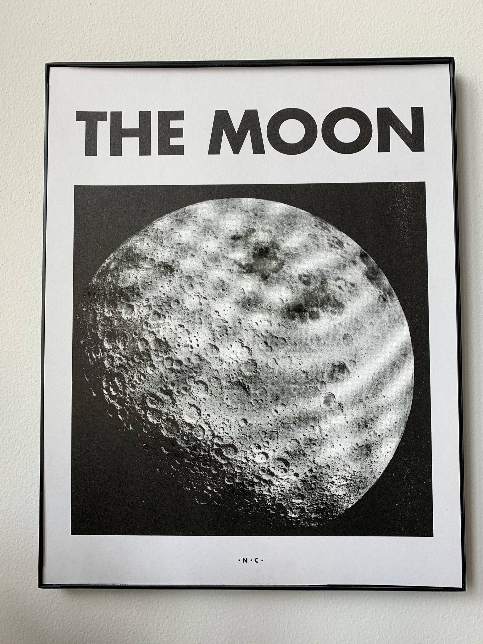 A Risograph black and white print of The Moon. Part of the planets print series. 11" x 14" paper 100lb Bright White Unframed Ships flat with board and plastic sleeve.